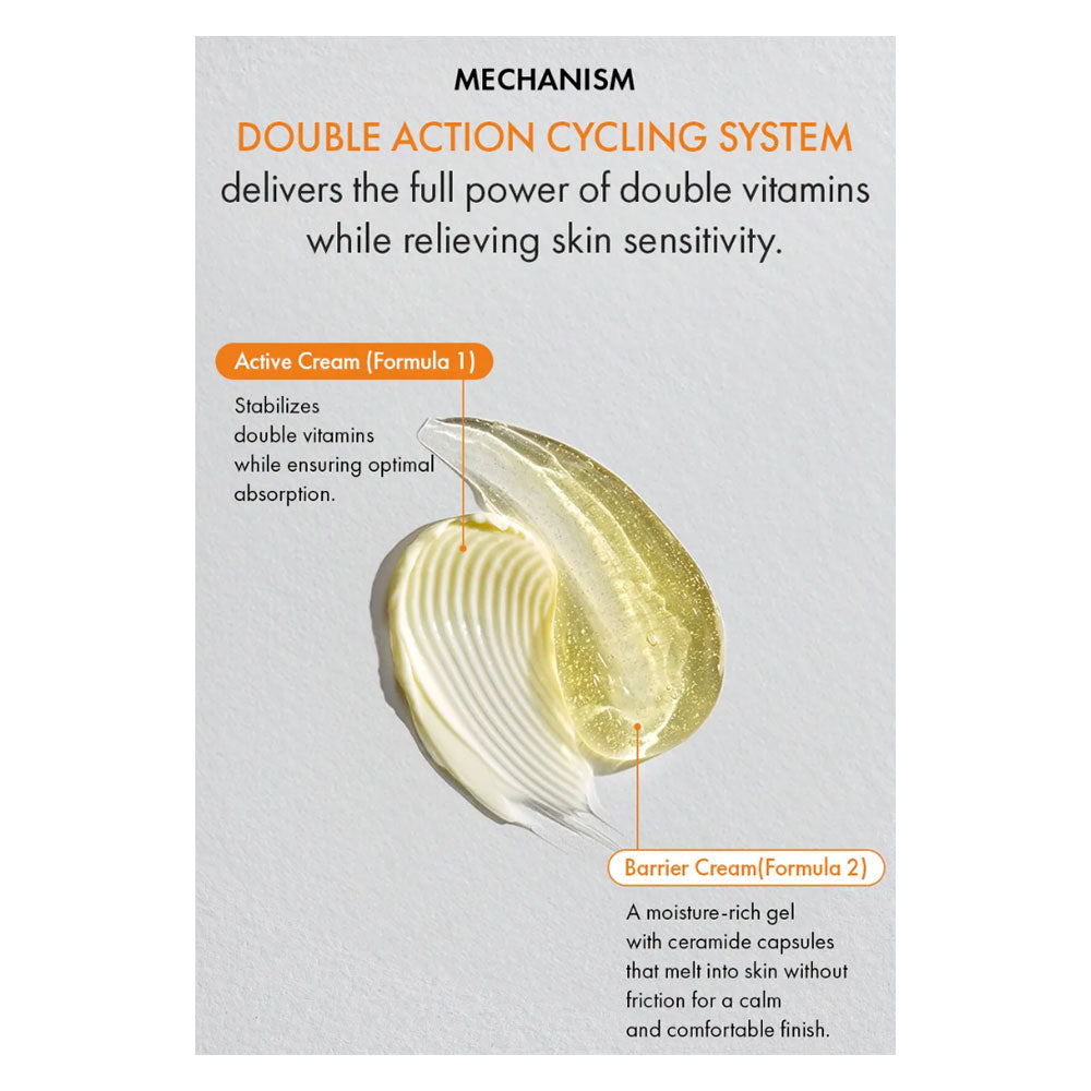 It uses a Double Action Cycling System that delivers the full power of double vitamins while relieving skin sensitivity. It contains the double formula of an active cream and a barrier cream in one product.