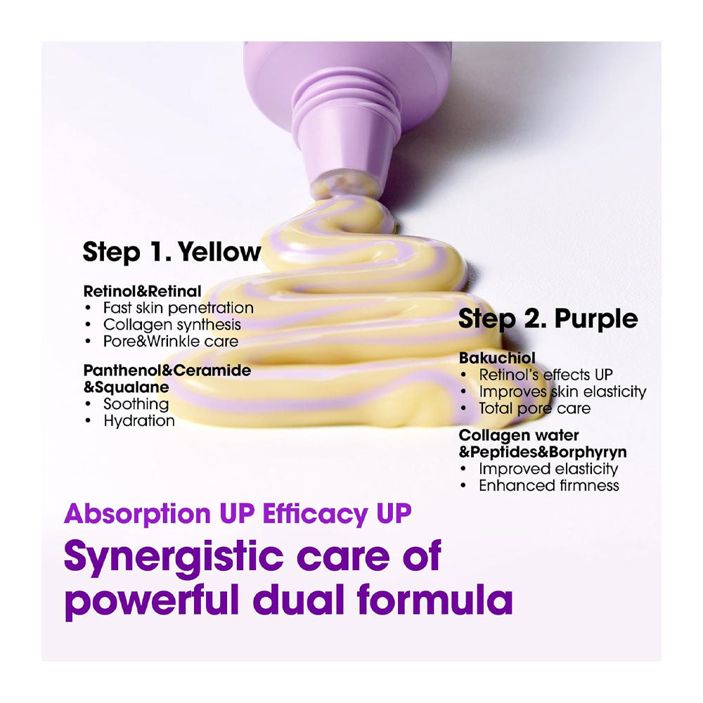It is a firming cream that works for smoother skin texture and is effective in reducing enlarged pores and improving pores texture. It contains Triple retinol (retinol + retinal+ bakuchiol) that boost skin elasticity while refining pores and enhancing firmness. The yellow cream (Step 1) targets pores and refines skin texture and is formulated with Retinol and retinal provide excellent and immediate effects to improve skin texture, enhance skin elasticity and make skin firmer, while the purple cream (Step 2) synergises with retinol to improve firmness from within and is formulated with bakuchiol and collagen. Bakuchiol, a next generation plant-based retinol that has the same efficacy as retinol that works gently to help minimise pores, improve the appearance of wrinkles and fine lines without irritation, so gentle that it can be used by sensitive skin, and collagen and Volufiline to boost hydration and firmness.