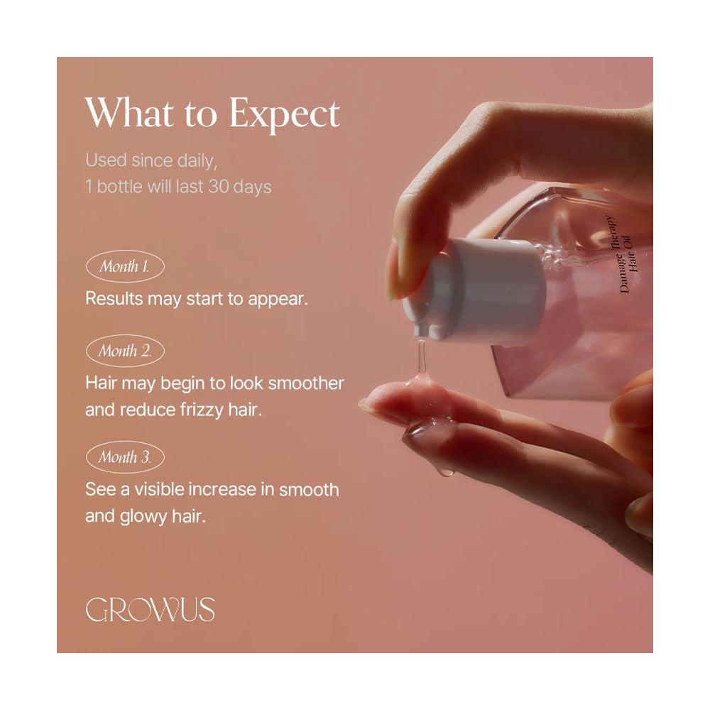 GROWUS Damage Therapy Hair Oil is a luxurious, multifunctional styling oil designed to offer a comprehensive solution for hair repair and care. Not only does it enhance and provide long lasting shine and strengthen the hair, it also provides protection against daily UV exposure and heat styling, controls and smooths frizz, and detangles hair, making it a versatile and essential addition to your hair care routine.