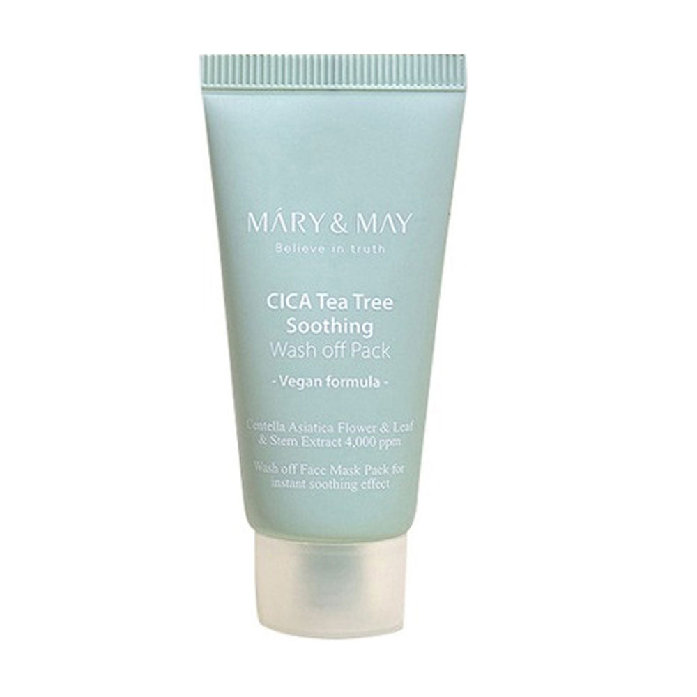 MARY & MAY CICA Tea Tree Soothing Wash off Pack contains grounded cica leaves, stems and flowers to quickly soothe and revitalise tired skin.