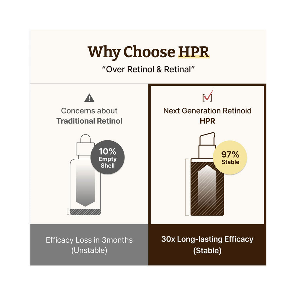 HPR delivers visible results beyond retinol and retinal, with visible improvements in wrinkles, pores, and skin tone. Clinically proven 8x wrinkle refinement and 13x dark spot correction for smoother, radiant, youthful-looking skin.