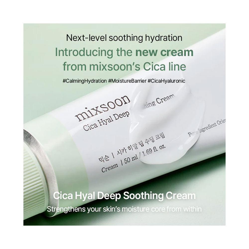 MIXSOON Cica Hyal Deep Soothing Cream is a hydrating and soothing solution designed for sensitive skin. It provides deep hydration and calming relief with its powerful blend of ingredients Centella Asiatica Extract, Cica Hyal Complex, Ceramide, and Panthenol, that also help strengthen the skin's moisture barrier, soothe irritation, and lock in moisture, leaving the skin soft, smooth, and resilient.