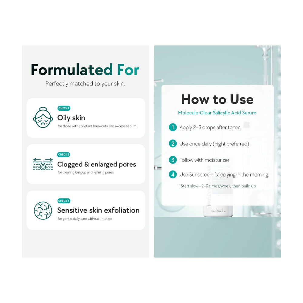 Your skin deserves more than harsh scrubs. NINE LESS MOLECULE-CLEAR Salicylic Acid Serum is a gentle daily exfoliating serum uses Salicylic Acid to decongest pores, sweep away dead skin cells, and smooth rough texture — without irritation or dryness.