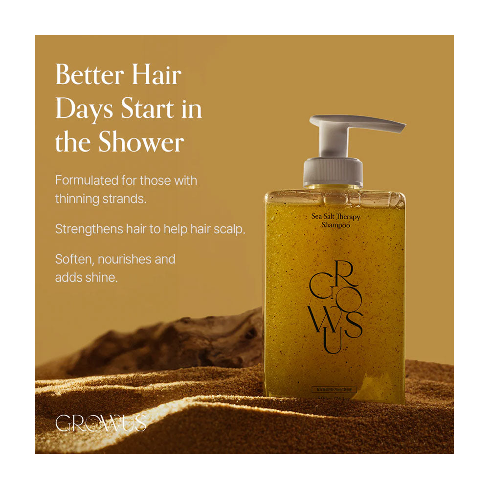 Refresh your scalp and revive your hair with this deep-cleansing, purifying shampoo, expertly formulated to exfoliate, detoxify, and balance. Powered by a dynamic trio of Sea Salt, BHA, and Seaweed Complex, GROWUS Sea Salt Therapy Shampoo gently removes buildup, excess oil, and dead skin cells, promoting a healthier scalp environment.