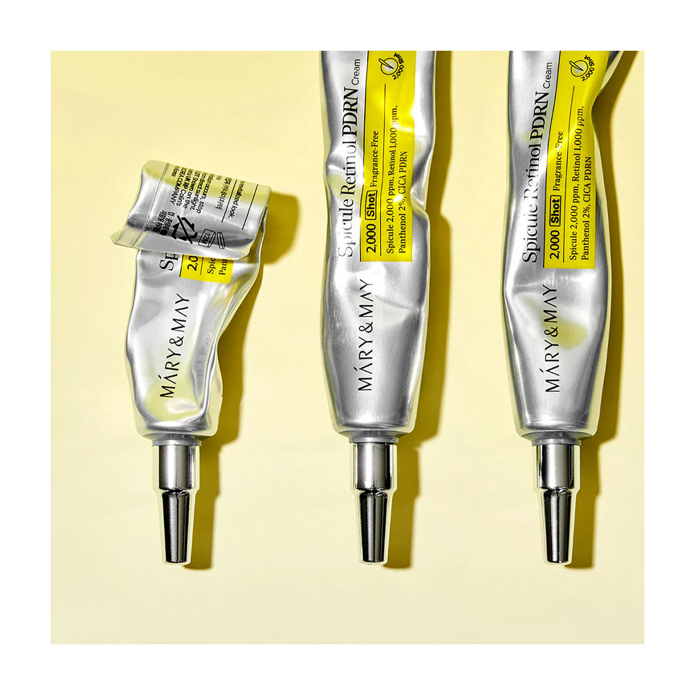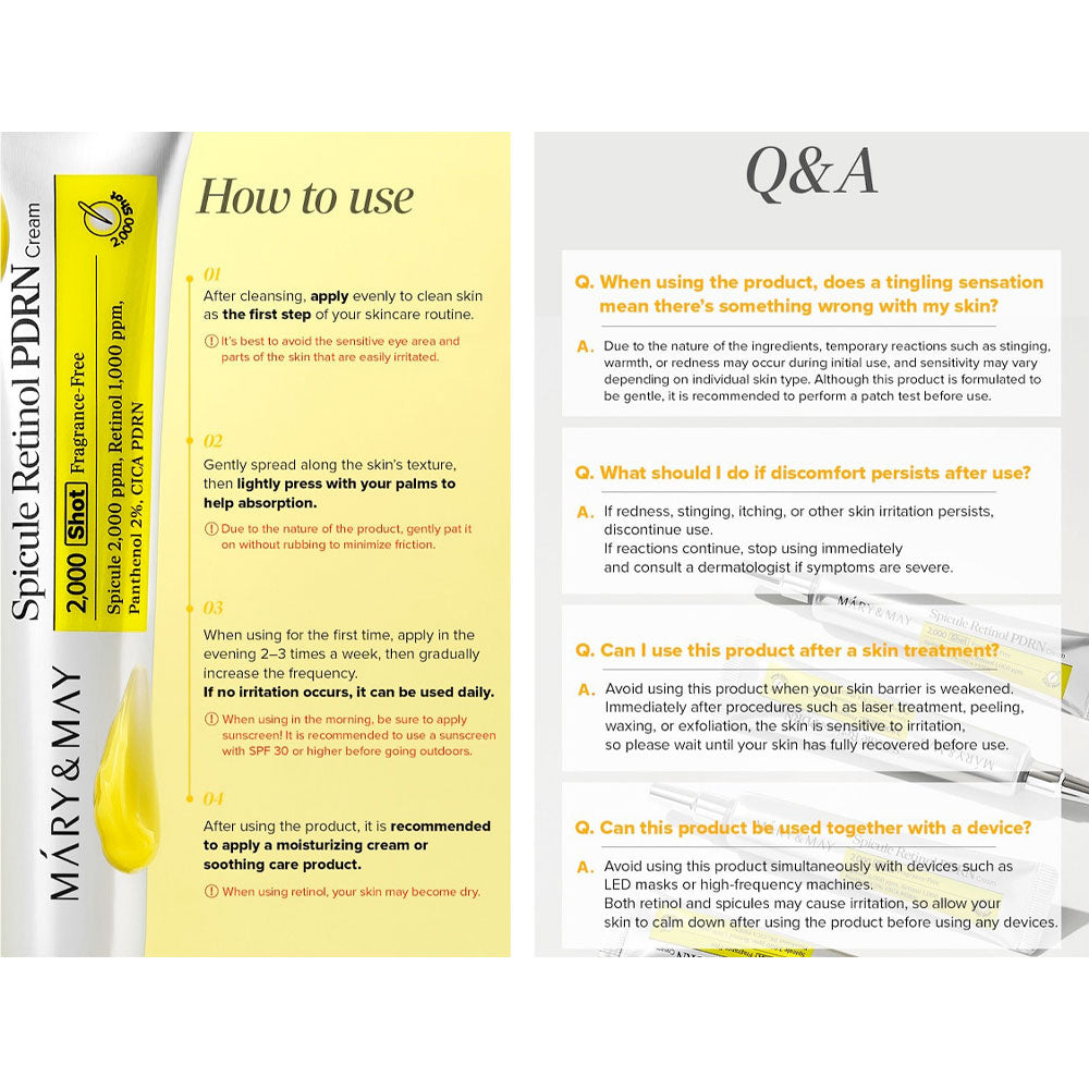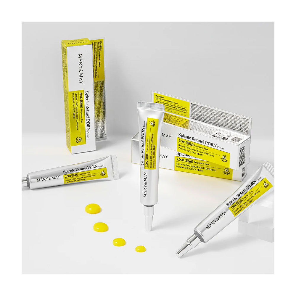 Smooth with retinol. Erase imperfections with PDRN. Mary&May Spicule Retinol PDRN Cream is a cream containing natural marine-derived micro-spicules that are 1/40 the size of pores, nano liposome retinol, and soothing ingredient panthenol that enhances the improvement of wrinkles, pores, and skin texture, with added CICA PDRN that both soothes and promotes recovery.