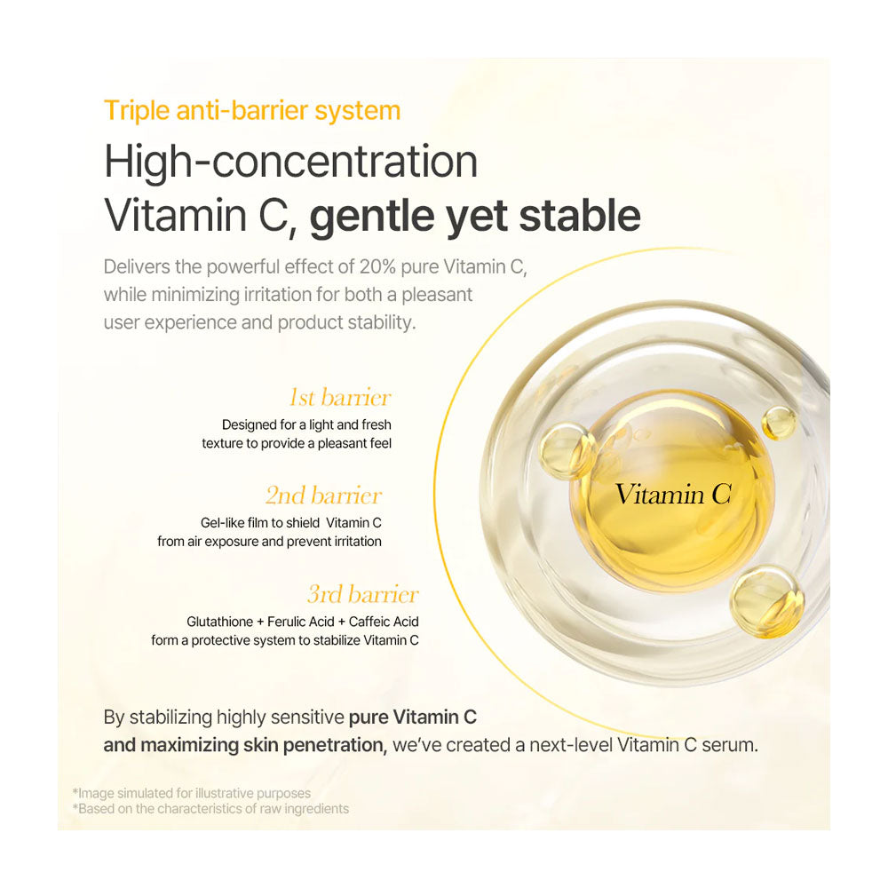 Formulated with a triple anti-barrier system, the serum protects the potent Vitamin C from exposure, allowing it to deeply penetrate and improve the skin’s texture without irritation. It also includes Niacinamide and Glutathione to boost brightness, improve skin elasticity, and maintain a healthy, smooth complexion.