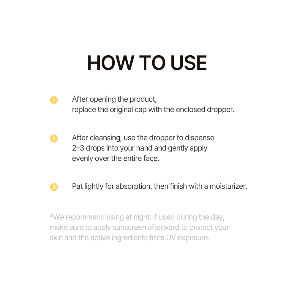 2. After cleansing, use the dropper to apply 2–3 drops onto your hand and spread evenly over the entire face.