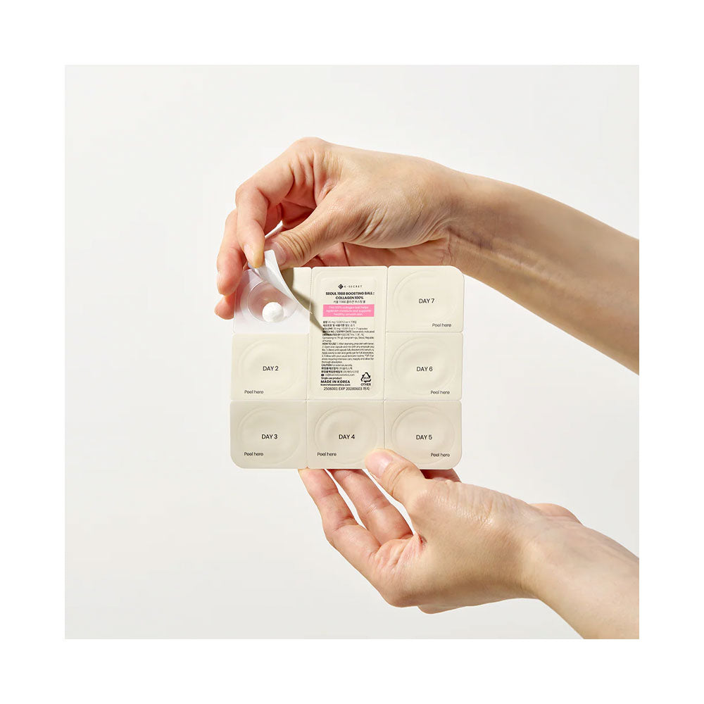 Formulated with 100% collagen, KSECRET Seoul 1988 Boosting Ball : Collagen 100% is a soft-melting sphere, full of 100% collagen that deeply hydrates and firms the skin for a youthful glow, delivering pure power of collagen for enhanced elasticity.
