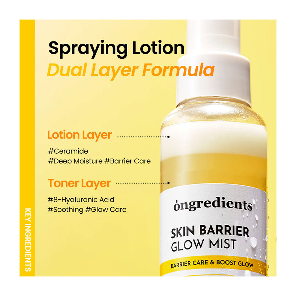ONGREDIENTS Skin Barrier Glow Mist helps to care for the skin barrier, dark spots, and blemishes for an even tone and radiant complexion.